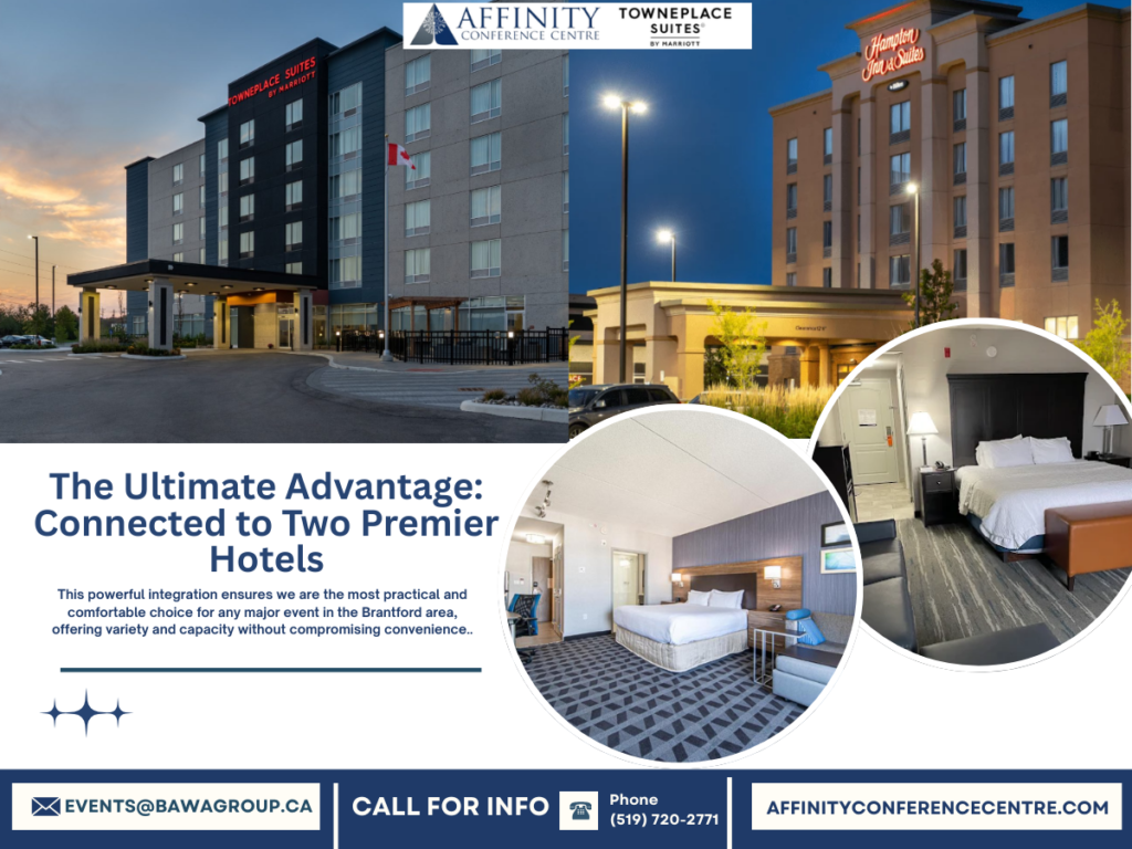 One of the biggest advantages of choosing the Affinity Conference Centre is the extraordinary convenience of being directly connected to the TownePlace Suites by Marriott Brantford. Additionally, we are closely located next to the Hampton Inn & Suites By Hilton Brantford Conference Centre.